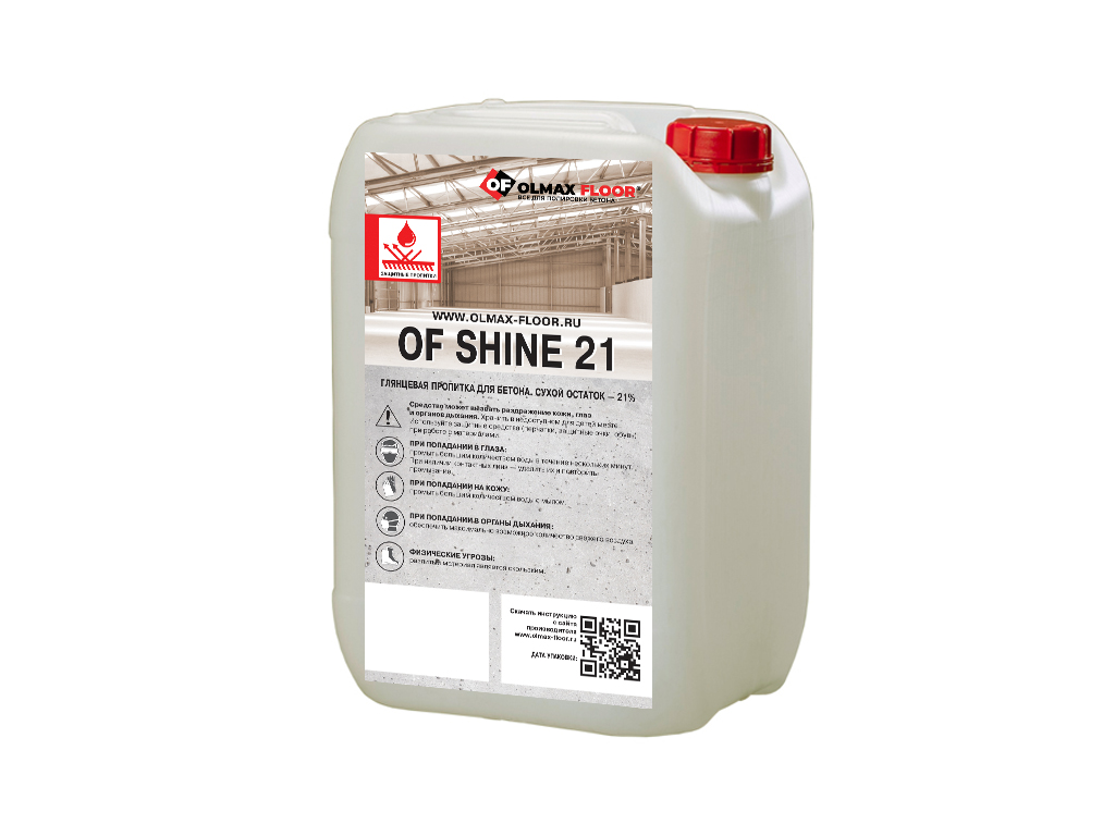 OF Shine 21 (Шайн 21), сух.ост 21%– литиевая, высокоглянцевая пропитка с повышенной стойкостью к проникновению агрессивных сред, используемая для улучшения глянца, увеличения твердости, химической стойкости шлифованного и полированного бетона. Продукт обладает двойным действием: литиевые силикаты проникают в бетон, упрочняют его, и в тоже время полимерные компоненты формируют прочную и «дышащую» микропленку на поверхности, которая не отслоится при эксплуатации пола.